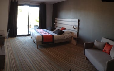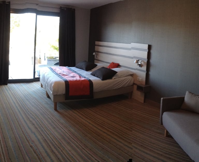 Profitez d'un séjour raffiné dans cette chambre d'hôtel cosy, équipée de tout le confort moderne et d'une décoration intérieure élégante pour une expérience unique et inoubliable.